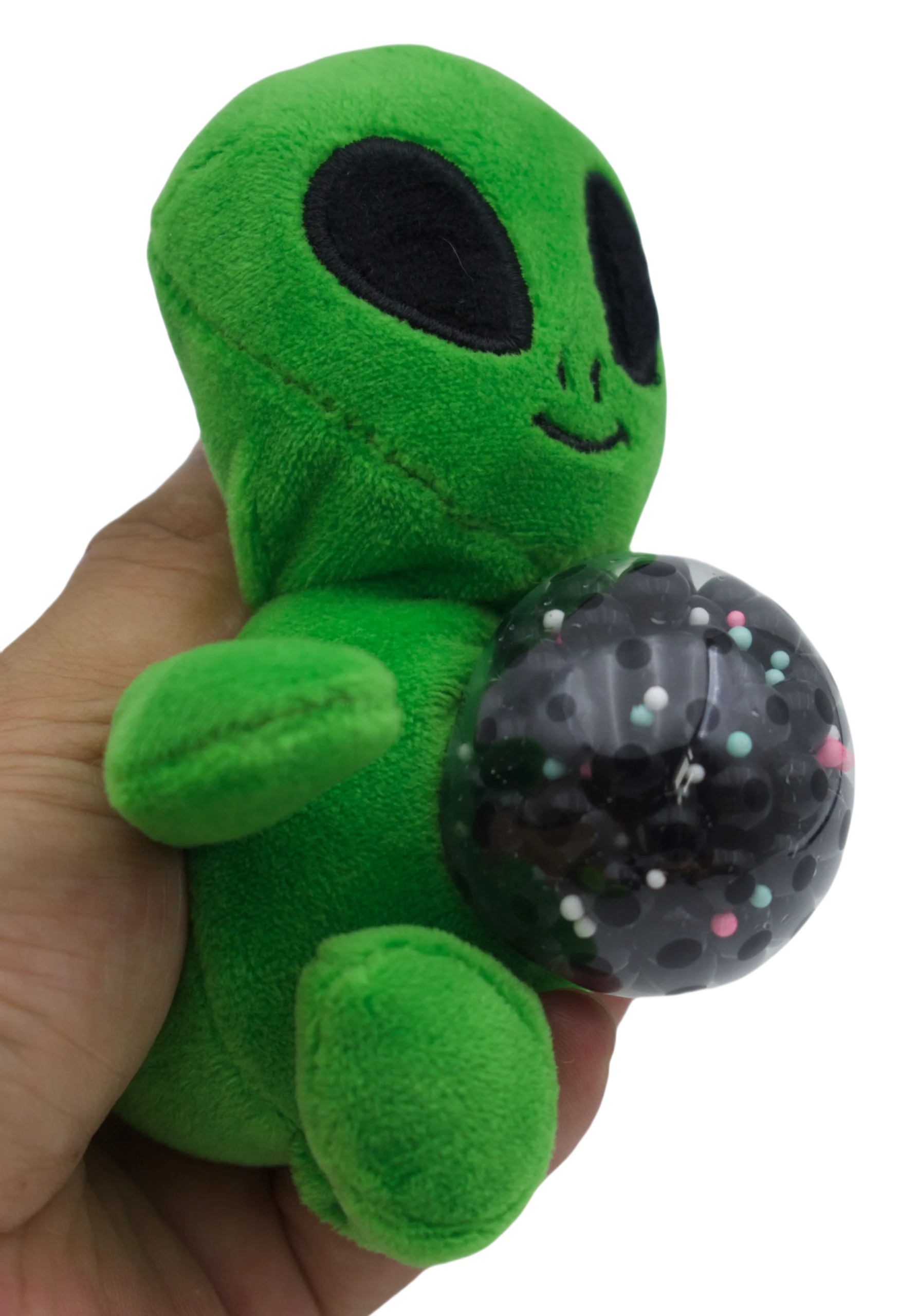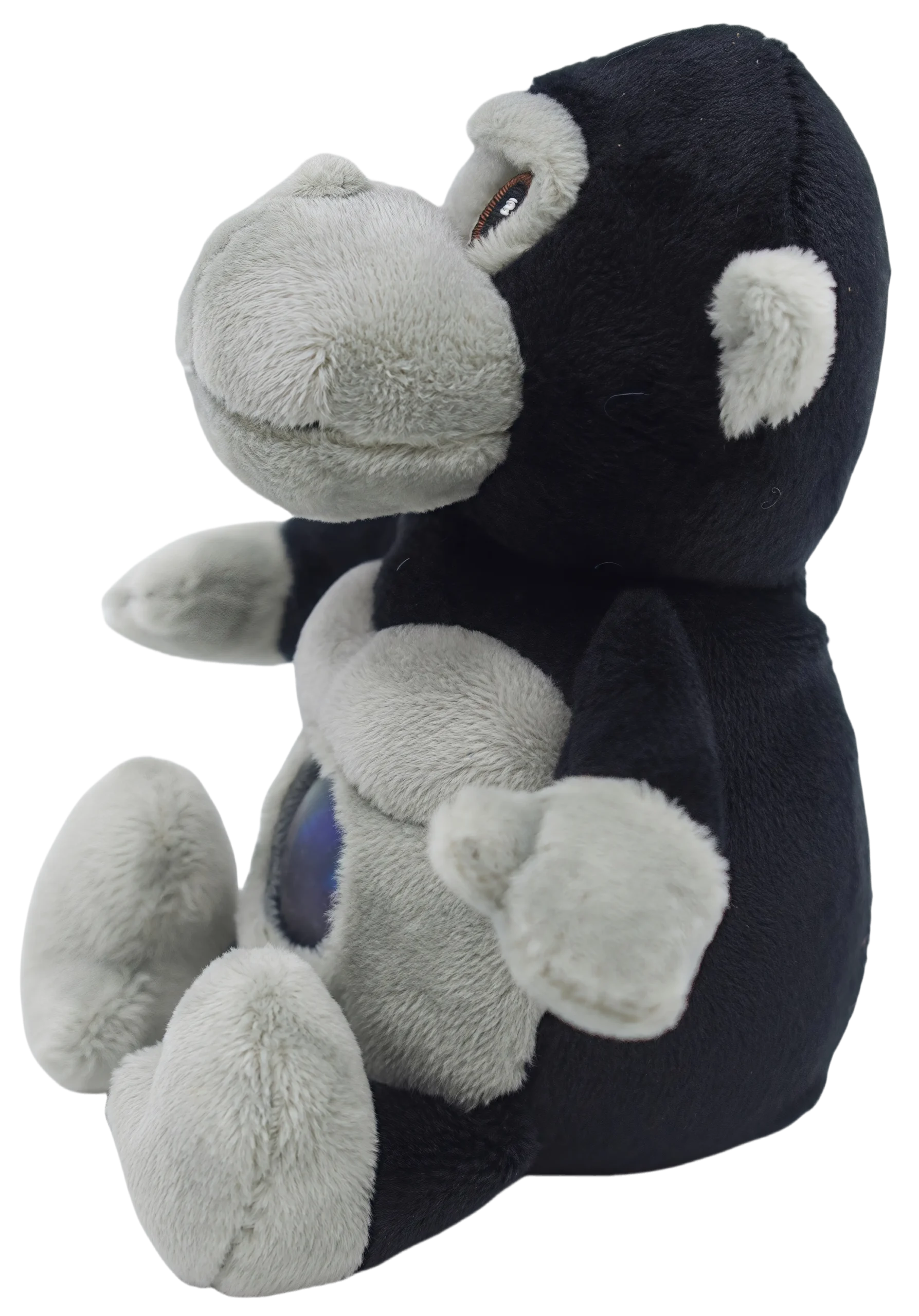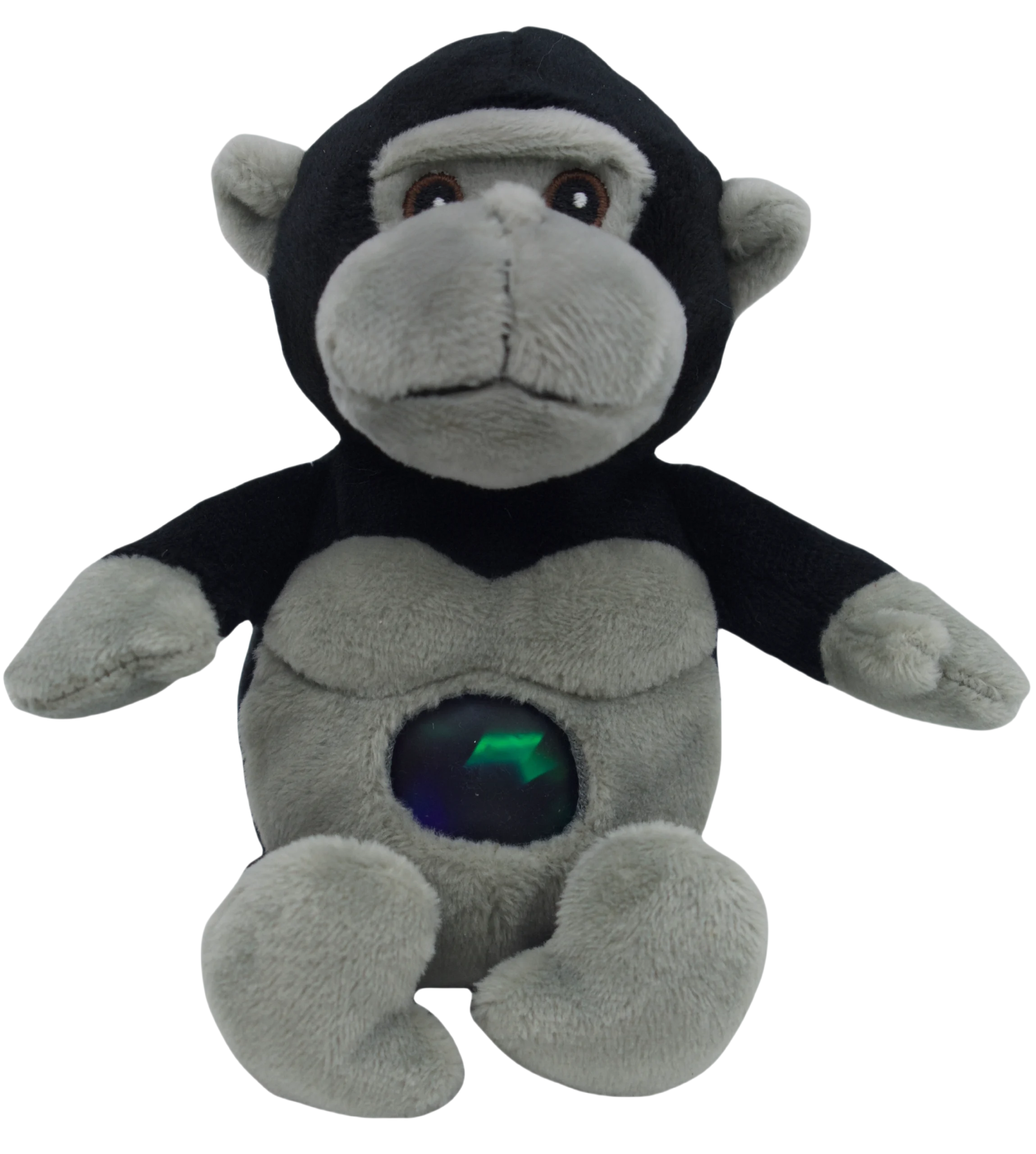 This is a plush toy in the shape of a chimpanzee. It has a black head and limbs, with a gray face, chest, and feet. The chimpanzee’s belly has a circular area with a green lightning – like pattern inside. This kind of toy is usually designed for stress relief. When you feel stressed, you can squeeze the circular part on its belly. The soft plush material and the unique touch of the circular part can help you relax. It is not only a cute toy but also a good helper for relieving stress.