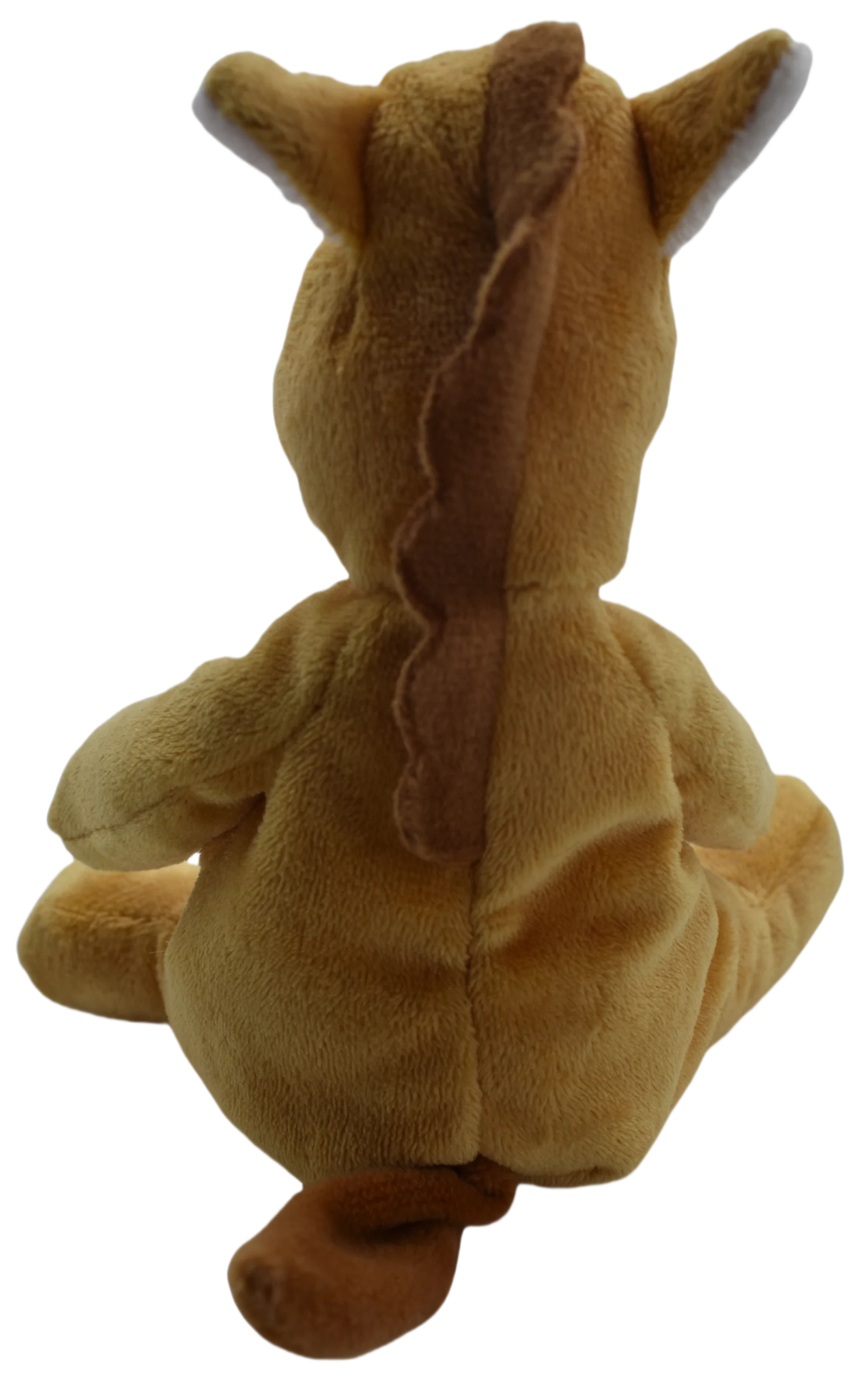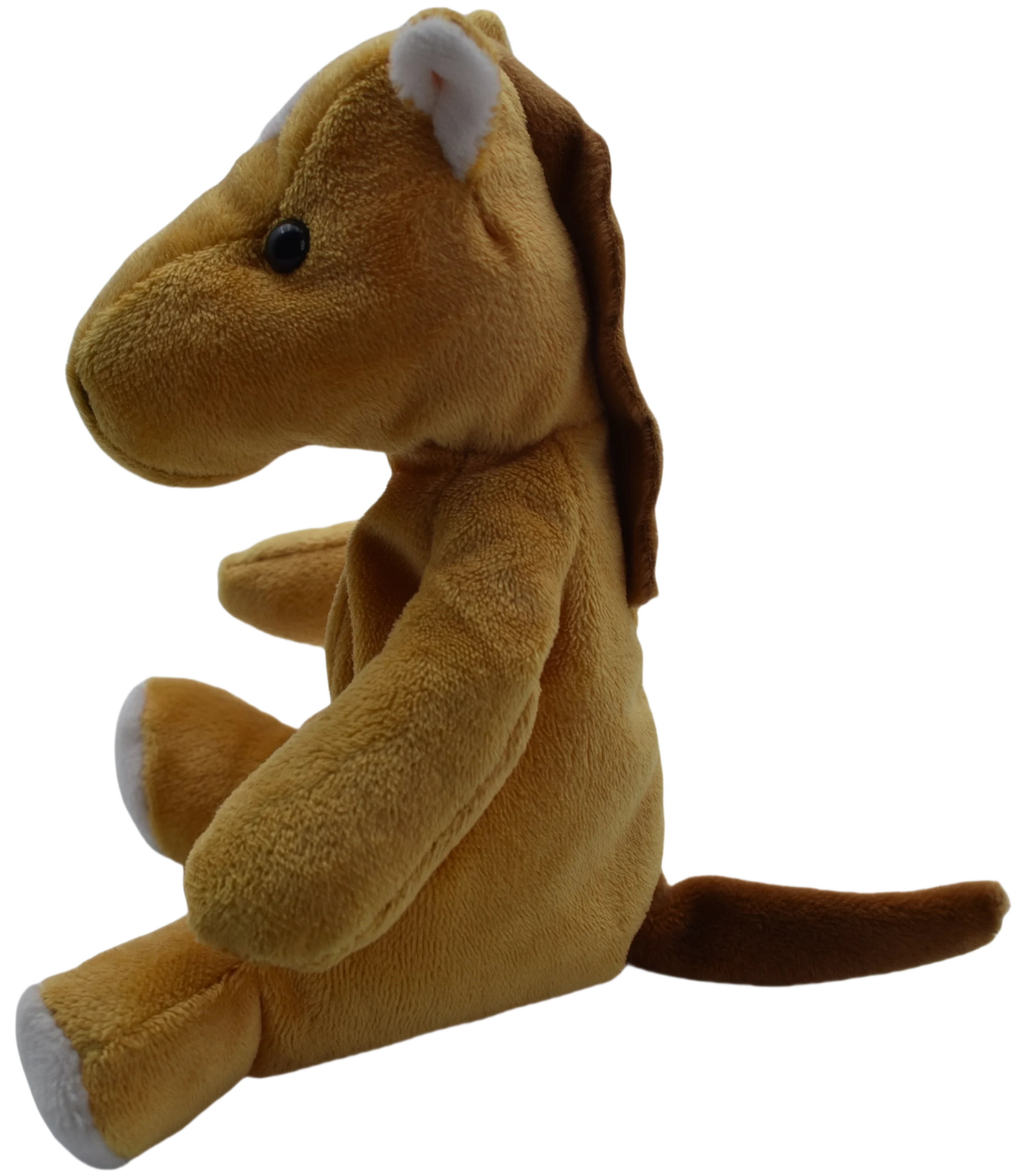 This is a plush toy horse. It looks very cute, with a soft and fluffy texture. Its fur is grayish-brown, and its long neck and flowing mane make it look very vivid. It can be a lovely companion for children, bringing them joy and comfort.