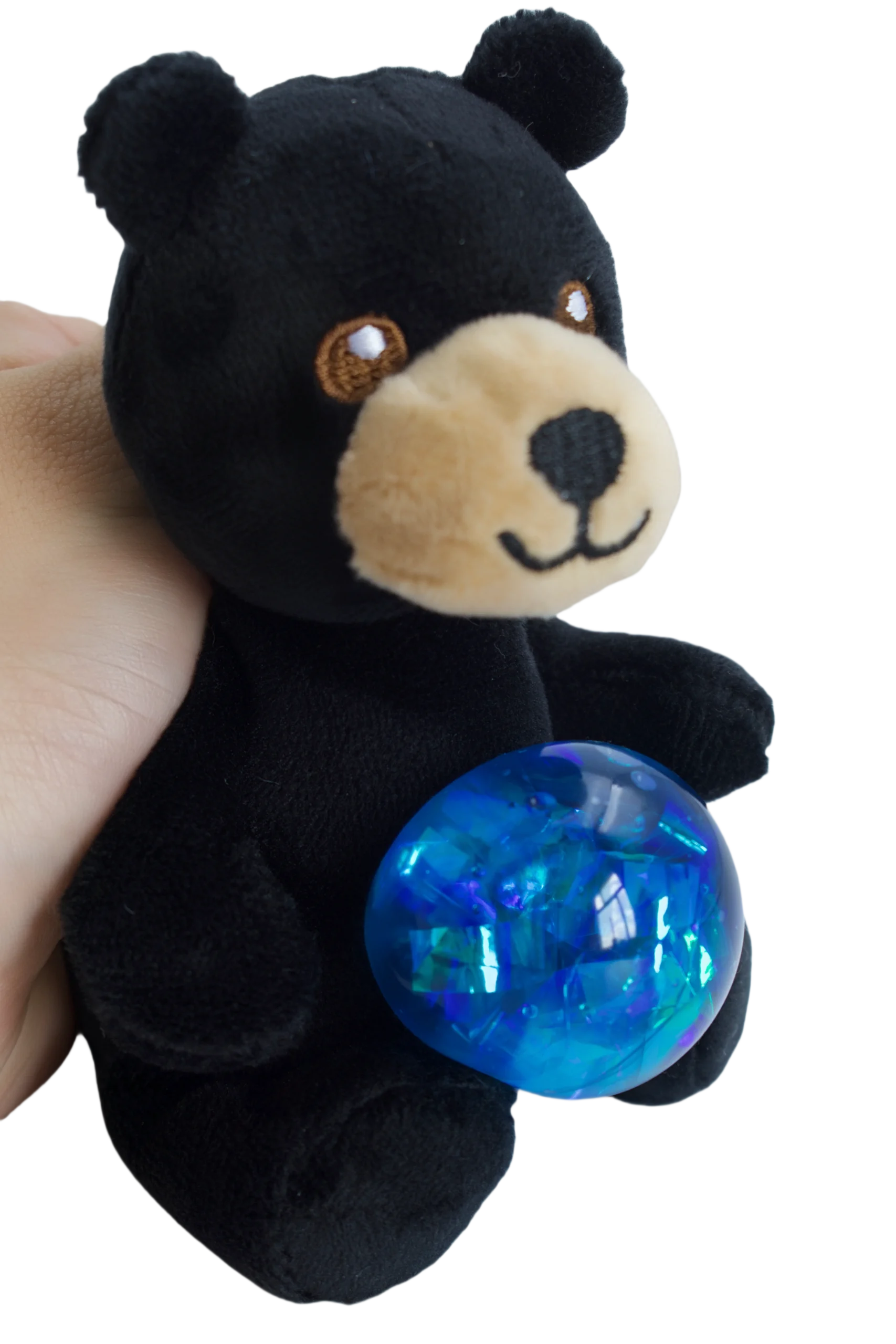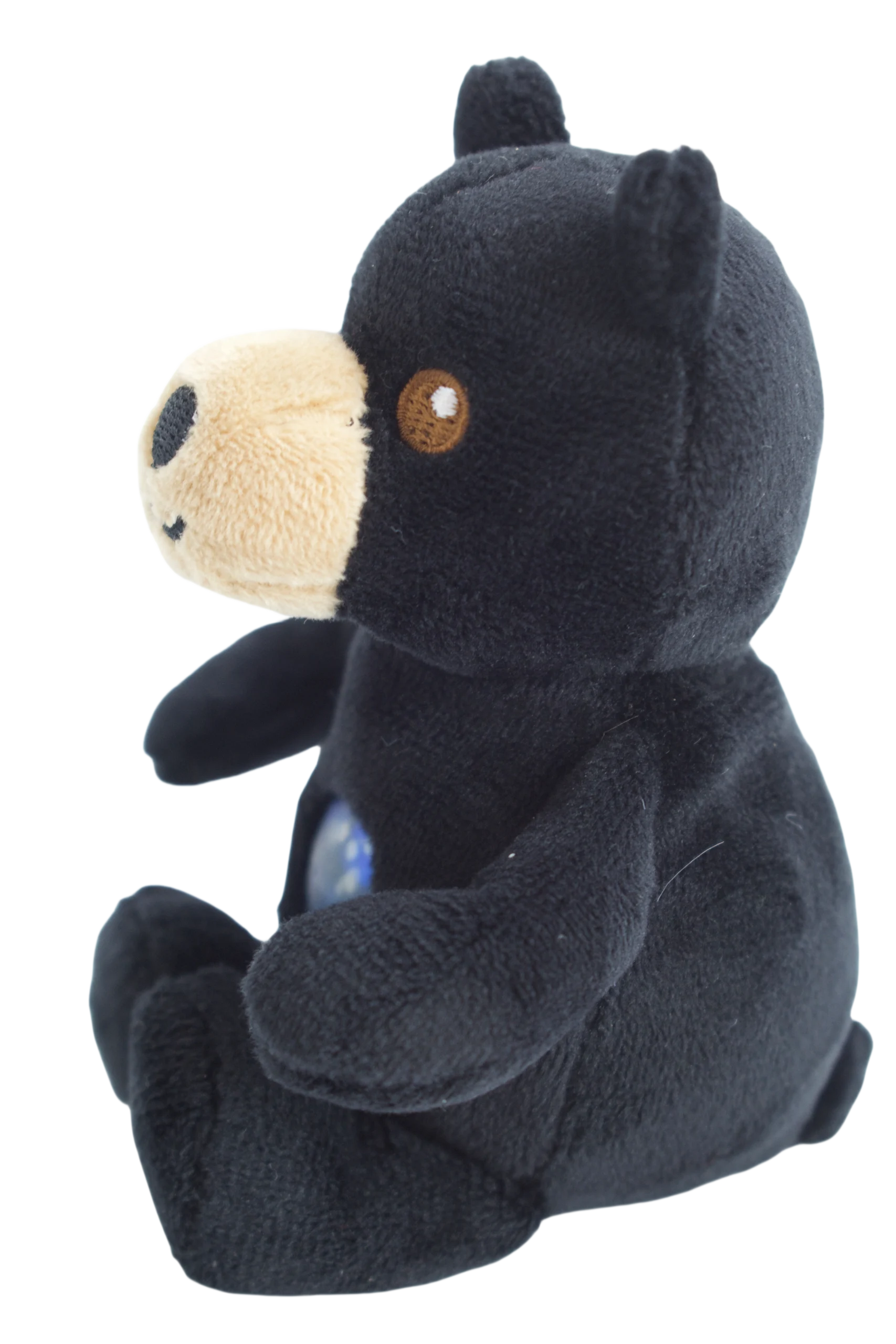This is a black bear plush toy. Its ears, body, and limbs are black, while the area around its eyes and nose is light beige. The bear has brown eyes and a black nose, with a smiling expression on its face. There is a blue and green round decoration on its belly, and the background of the picture is pure white.