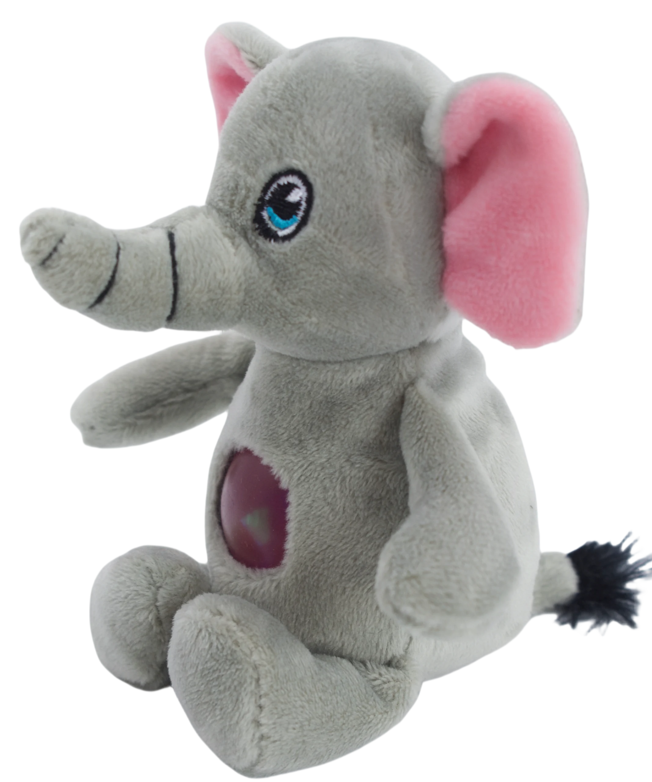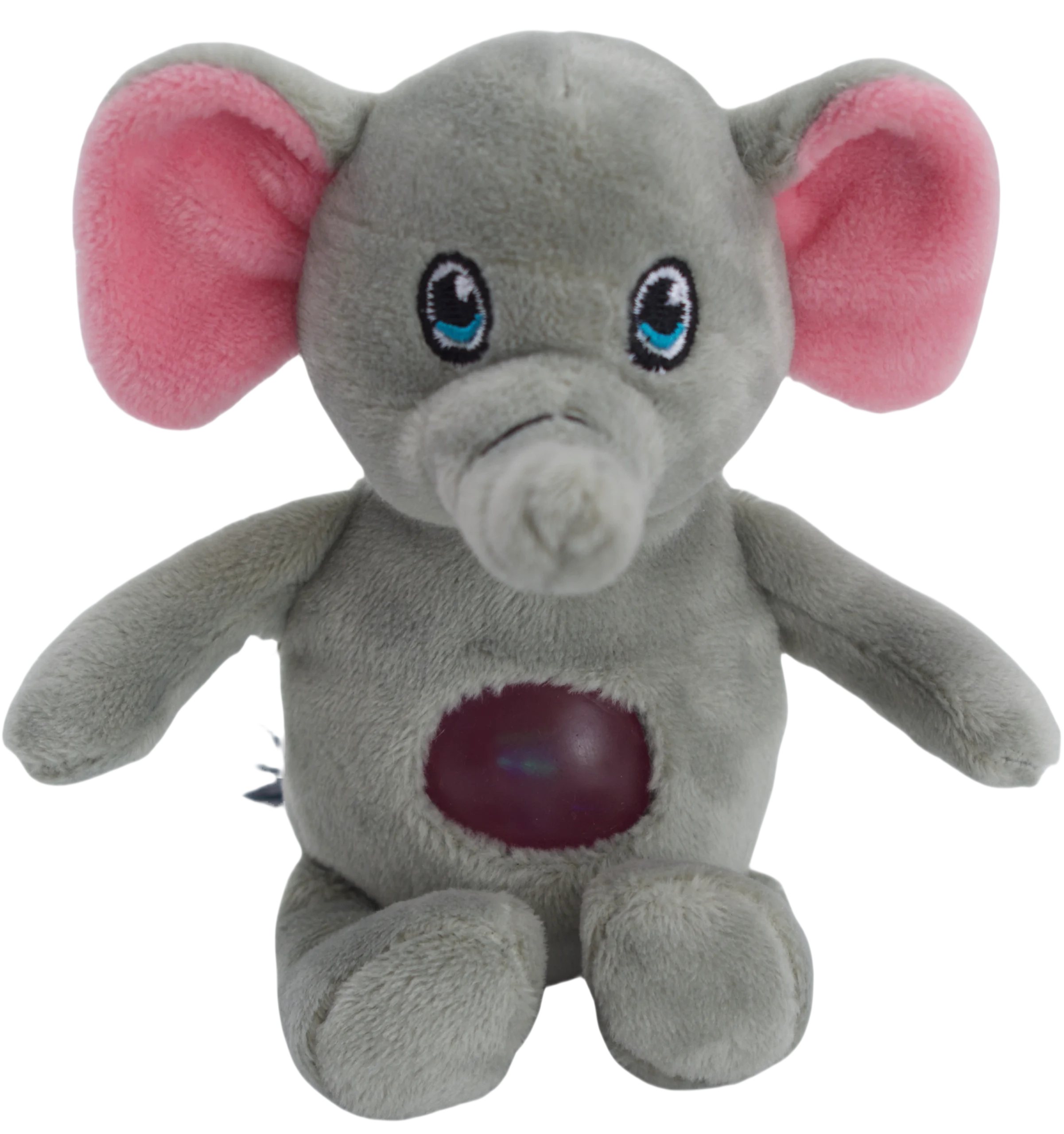 This is a plush toy of an elephant. Its main body is gray, and the inner part of its large ears is pink, which looks very cute. The elephant has big blue eyes, a short trunk, and is sitting. There is a dark red oval decoration on its belly, and the background of the picture is pure white.